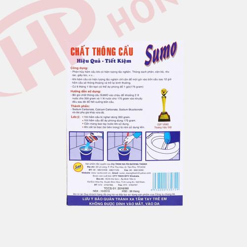 Chất thông cống Sumo giúp phân hủy cặn bã và làm sạch các đường cống khi có hiện tượng tắc nghẽn. Sản phẩm có khả năng làm sạch rêu, rác, giấy, tóc và các tạp chất khác trong nhà tắm, lavabo, sàn bếp, nhà cao tầng... Chỉ cần đổ một gói vào bồn cầu và sau 12 giờ, hệ thống sẽ thông thoáng và trở lại bình thường.
